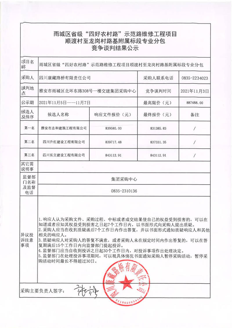 四川康藏路橋有限責(zé)任公司雨城區(qū)省級(jí)“四好農(nóng)村路”示范路維修工程項(xiàng)目順渡村至龍崗村路基附屬標(biāo)段專業(yè)分包競(jìng)爭(zhēng)談判結(jié)果公示