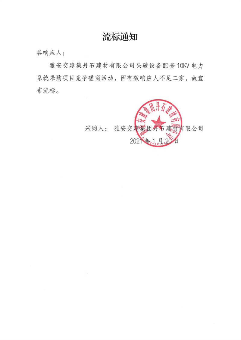 雅安交建集團(tuán)丹石建材有限公司頭破設(shè)備配套10KV電力系統(tǒng)采購項目流標(biāo)通知