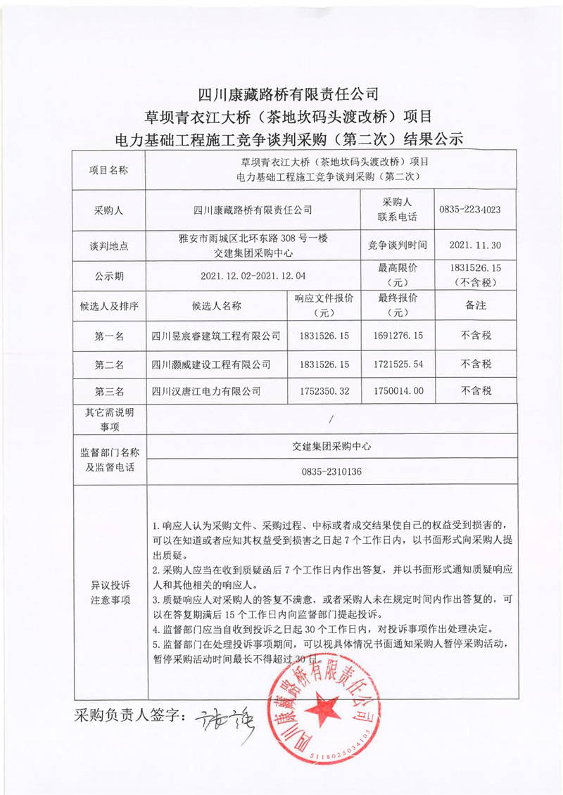 四川康藏路橋有限責(zé)任公司草壩青衣江大橋(茶地坎碼頭渡改橋)項目電力基礎(chǔ)工程施工競爭談判采購(第二次)結(jié)果公示