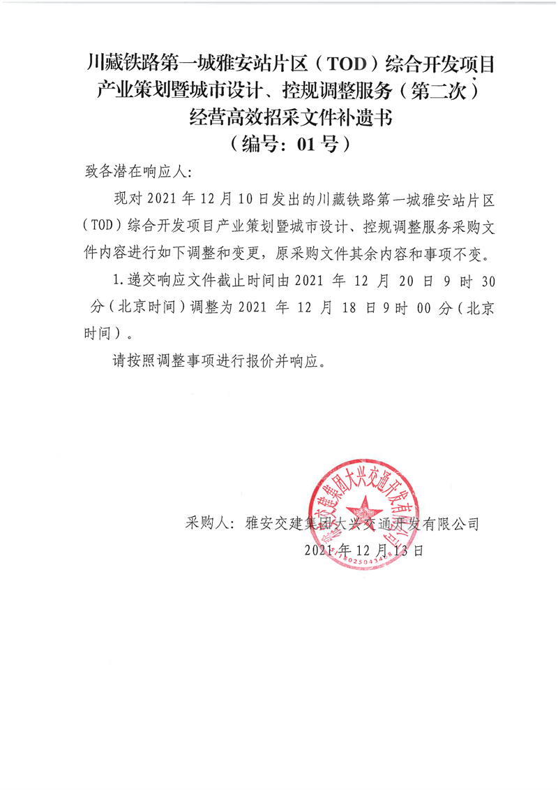 雅安交建集團(tuán)大興交通開發(fā)有限公司川藏鐵路第一城雅安站片區(qū)(TOD)綜合開發(fā)項(xiàng)目產(chǎn)業(yè)策劃暨城市設(shè)計(jì)、控規(guī)調(diào)整服務(wù)(第二次)經(jīng)營(yíng)高效招采文件補(bǔ)遺書(編號(hào):01號(hào))
