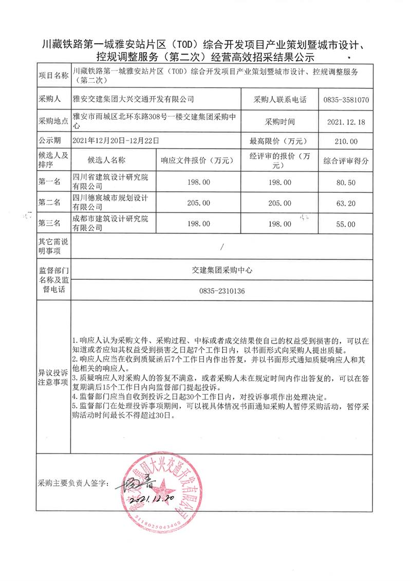 雅安交建集團大興交通開發(fā)有限公司川藏鐵路第一城雅安站片區(qū)(TOD)綜合開發(fā)項目產業(yè)策劃暨城市設計、控規(guī)調整服務(第二次)經營高效招采結果公示