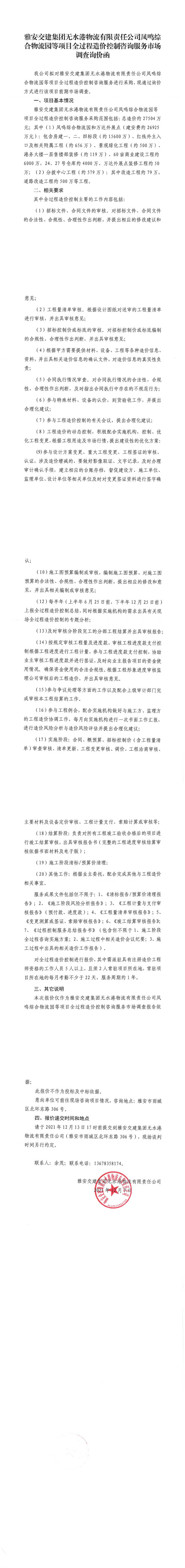 雅安交建集團無水港物流有限責任公司鳳鳴綜合物流園等項目全過程造價控制咨詢服務(wù)市場調(diào)查詢價函