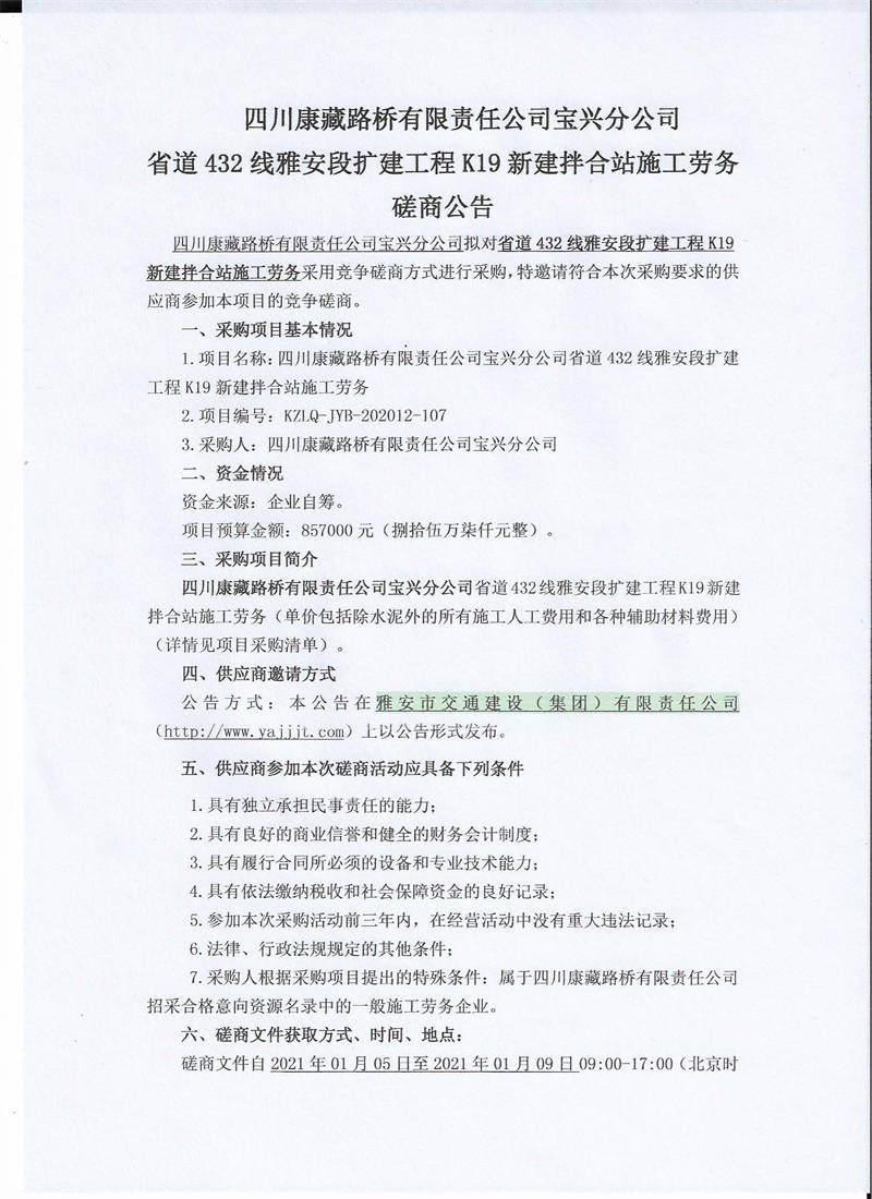 四川康藏路橋有限責(zé)任公司寶興分公司省道432線雅安段擴(kuò)建工程K19新建拌合站施工勞務(wù)磋商公告