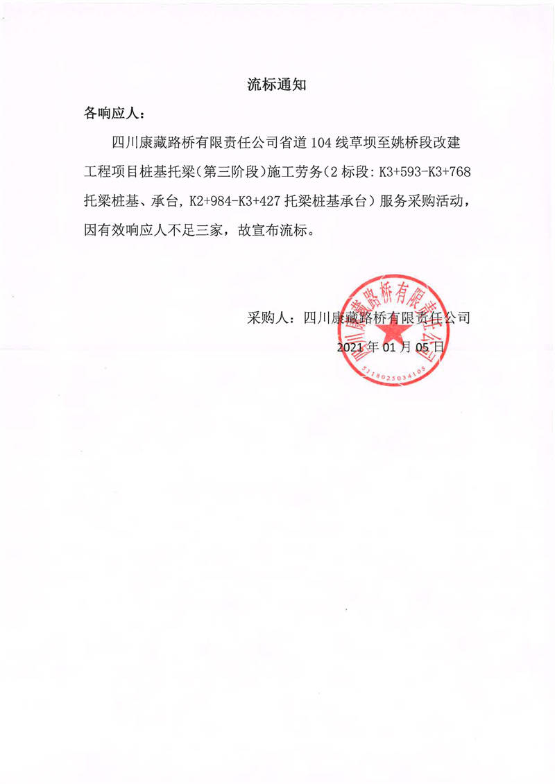 四川康藏路橋有限責(zé)任公司省道104線草壩至姚橋段改建工程項(xiàng)目樁基托梁(第三階段)施工勞務(wù)服務(wù)2標(biāo)段流標(biāo)通知