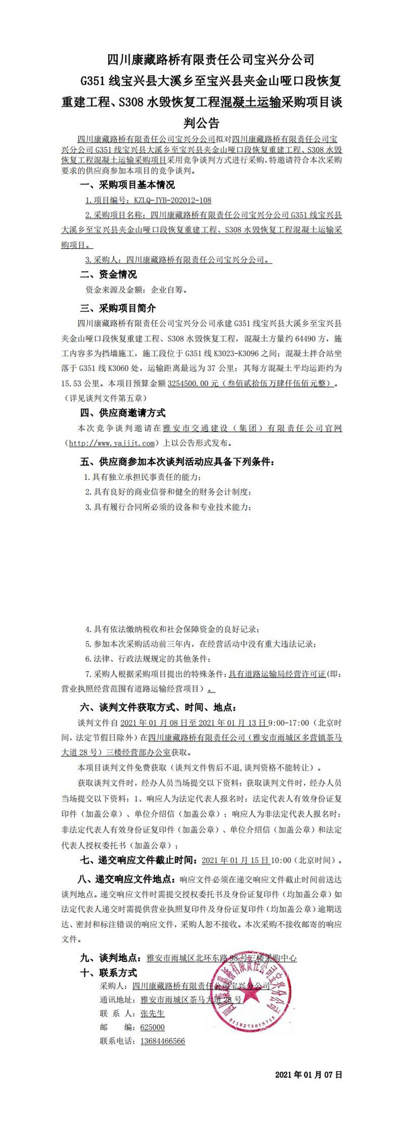 四川康藏路橋有限責(zé)任公司寶興分公司G351線寶興縣大溪鄉(xiāng)至寶興縣夾金山啞口段恢復(fù)重建工程、S308水毀恢復(fù)工程混凝土運(yùn)輸采購(gòu)項(xiàng)目談判公告