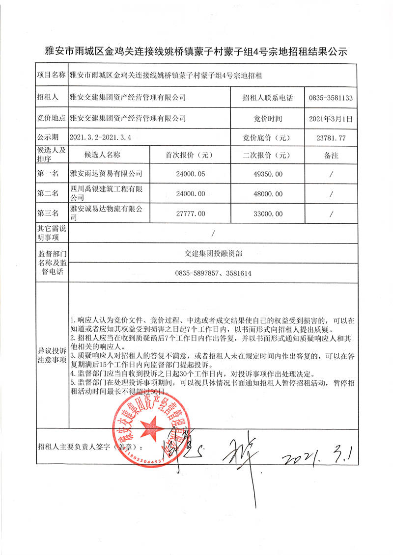 雅安交建集團資產(chǎn)經(jīng)營管理有限公司雅安市雨城區(qū)金雞關連接線姚橋鎮(zhèn)蒙子村蒙子組4號宗地招租結果公示