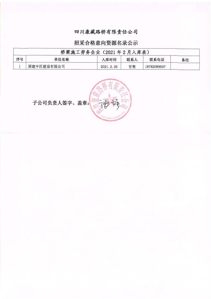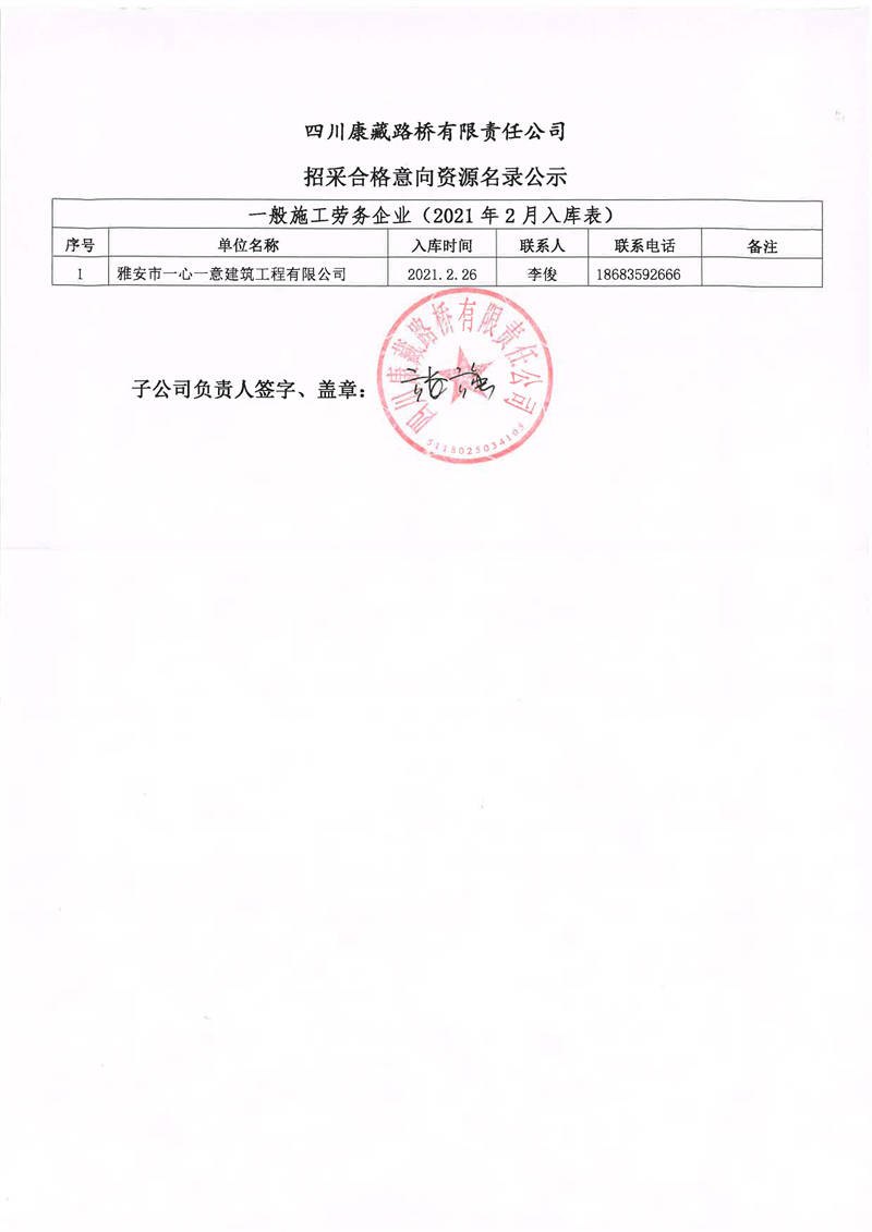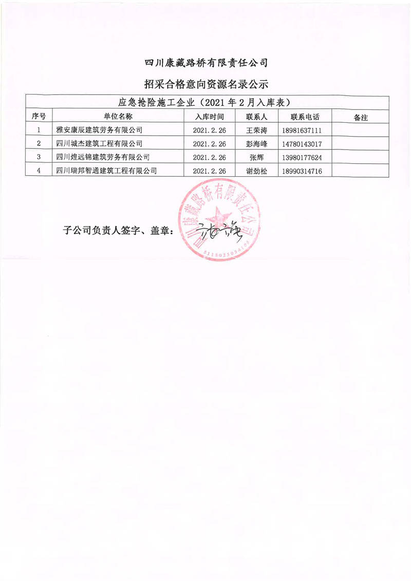 四川康藏路橋有限責(zé)任公司招采合格意向資源名錄補錄公示