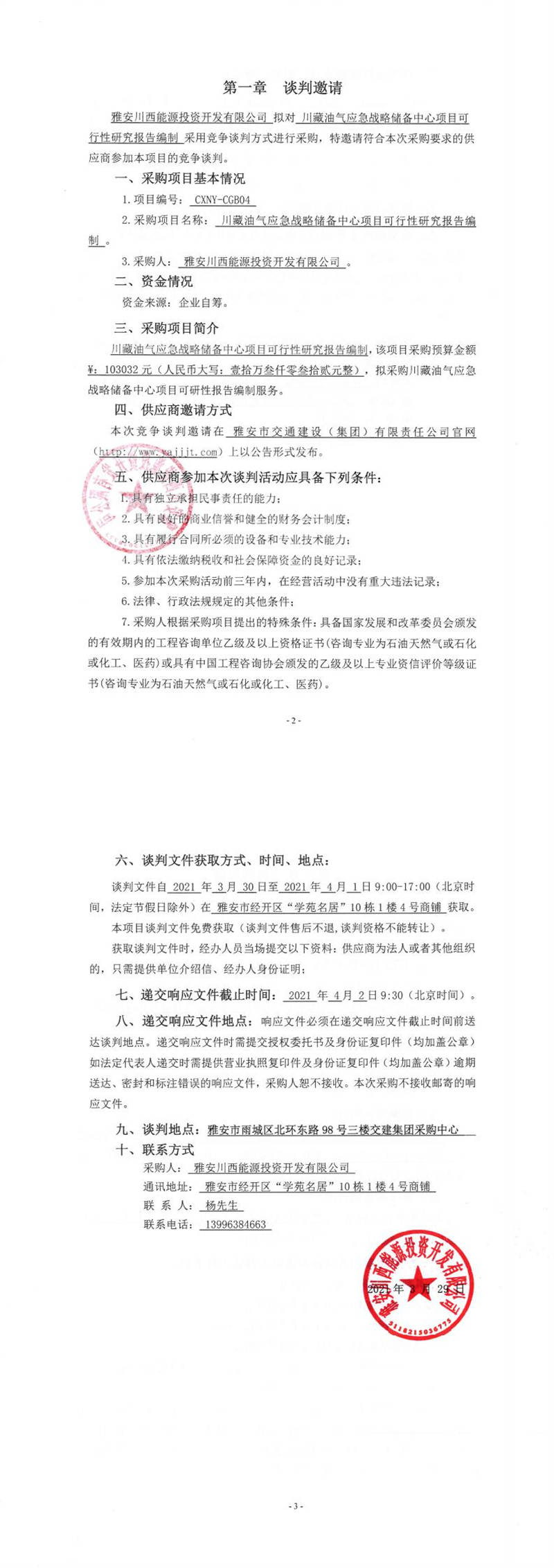 雅安川西能源投資開發(fā)有限公司川藏油氣應急戰(zhàn)略儲備中心項目可行性研究報告編制競爭談判公告