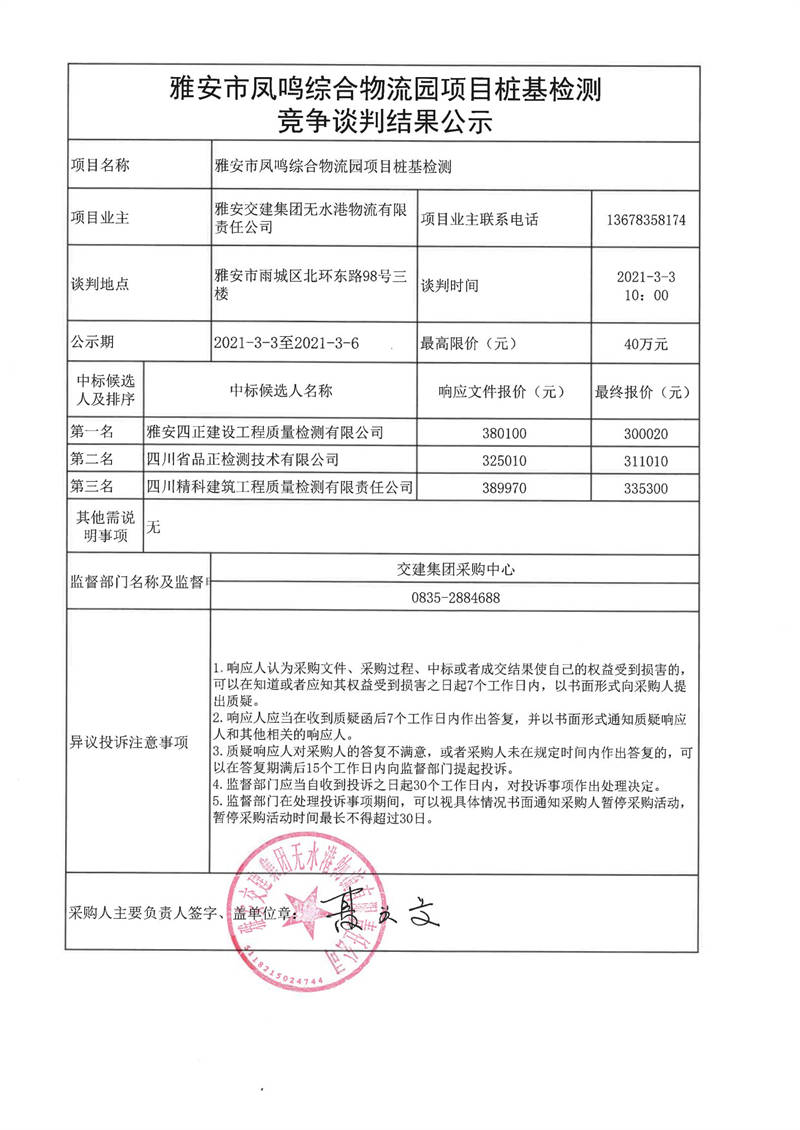 雅安交建集團(tuán)無水港物流有限責(zé)任公司雅安市鳳鳴綜合物流園項(xiàng)目樁基檢測競爭談判結(jié)果公示