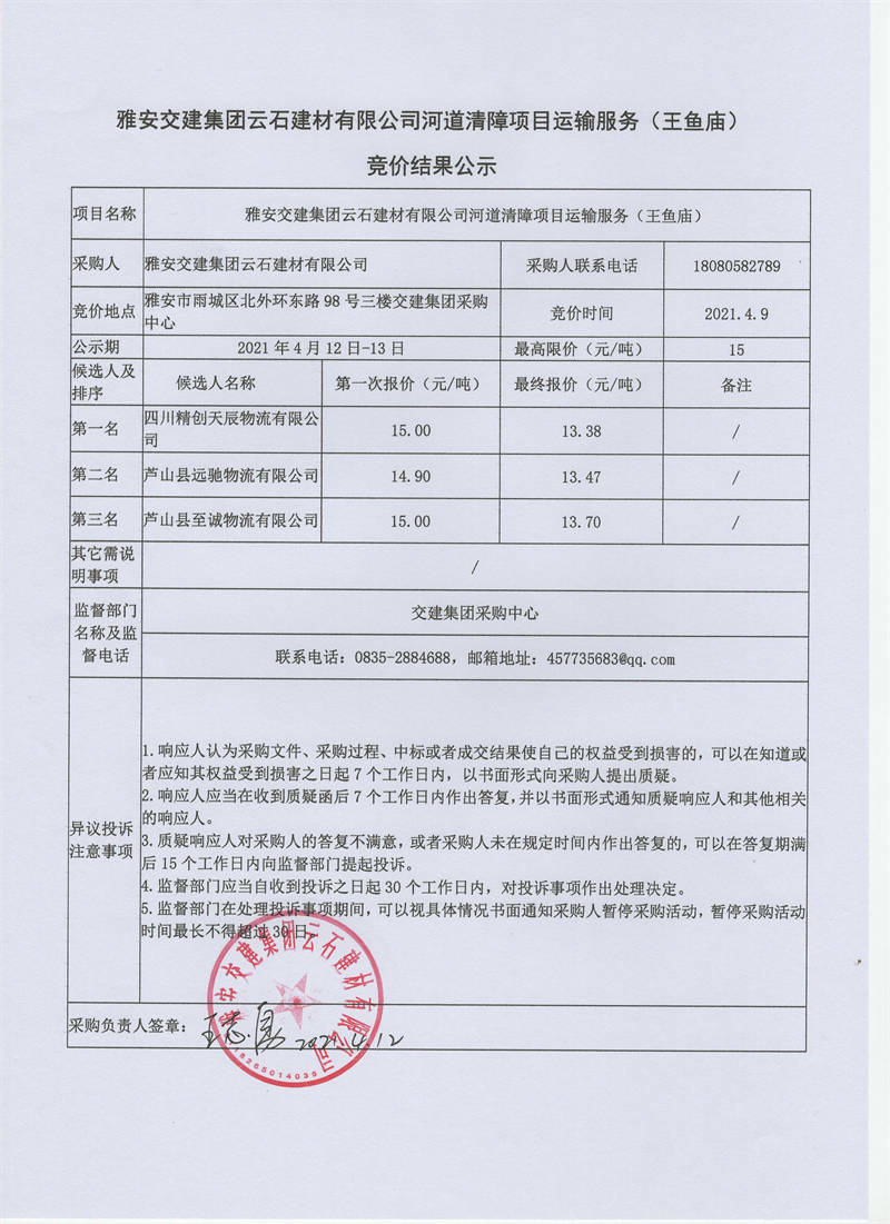 雅安交建集團云石建材有限公司河道清障項目運輸服務(wù)競價結(jié)果公示