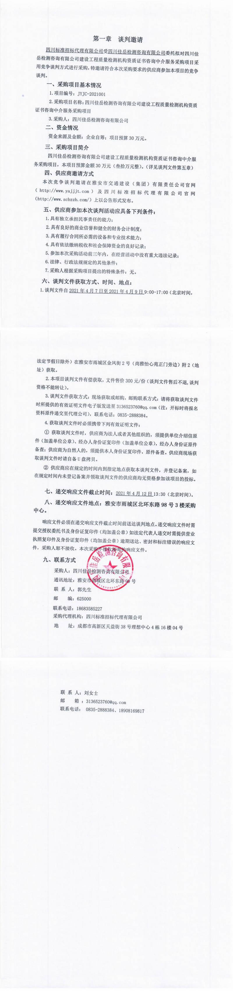 四川佳岳檢測(cè)咨詢(xún)有限公司建設(shè)工程質(zhì)量檢測(cè)機(jī)構(gòu)資質(zhì)證書(shū)咨詢(xún)中介服務(wù)采購(gòu)項(xiàng)目競(jìng)爭(zhēng)談判公告