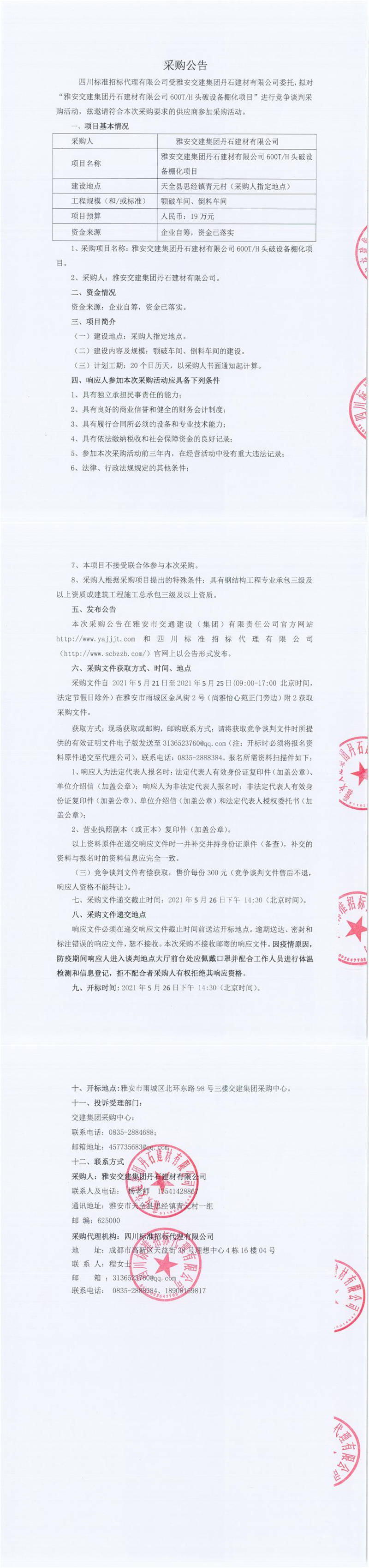 雅安交建集團丹石建材有限公司600T/H頭破設備棚化項目競爭談判公告