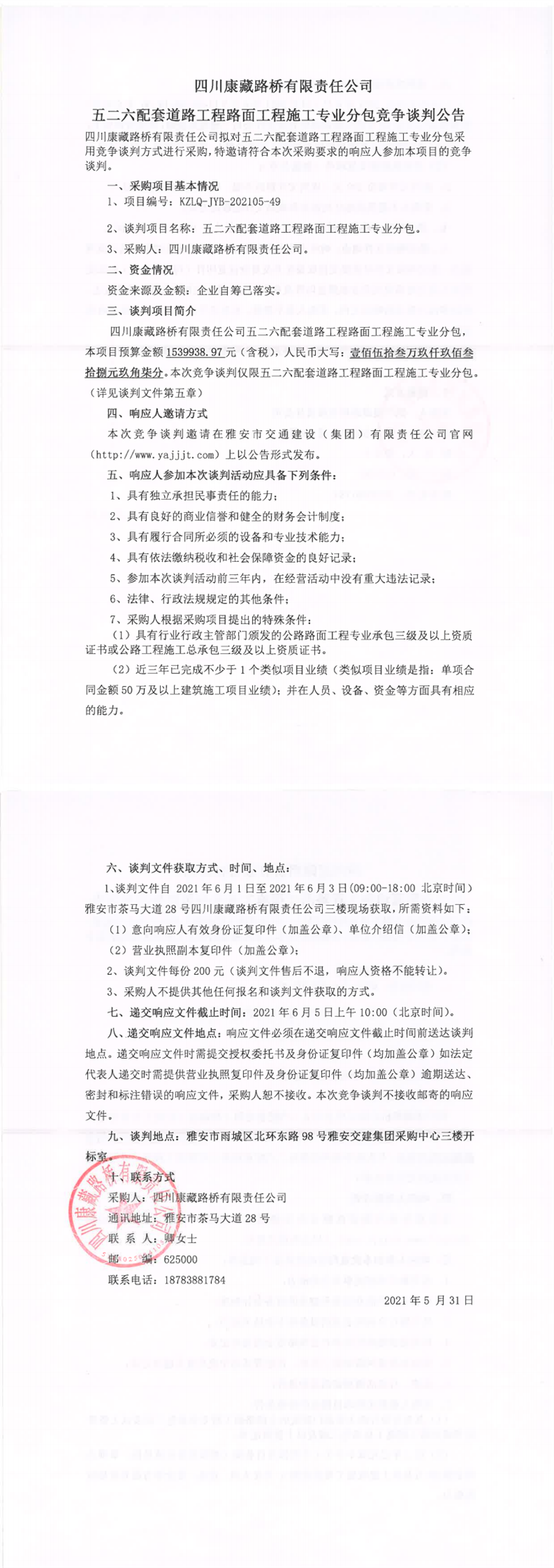 四川康藏路橋有限責(zé)任公司五二六配套道路工程路面工程施工專(zhuān)業(yè)分包競(jìng)爭(zhēng)談判公告