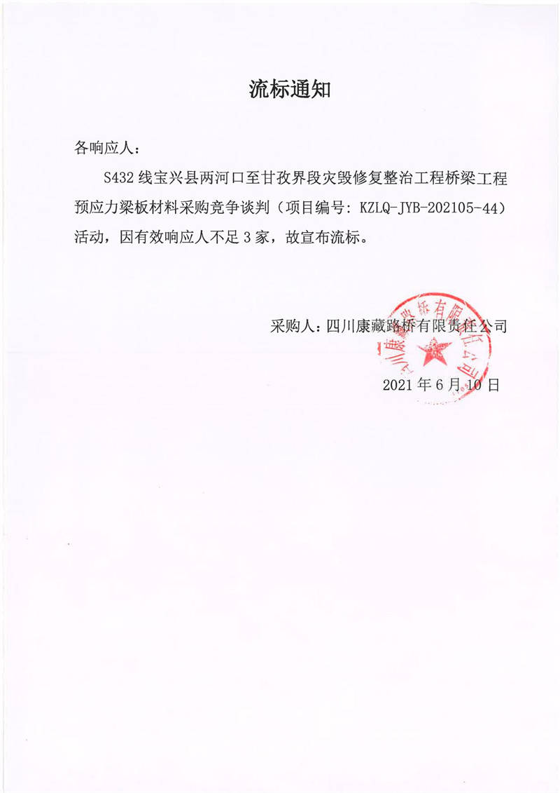 四川康藏路橋有限責(zé)任公司S432線寶興縣兩河口至甘孜界段災(zāi)毀修復(fù)整治工程橋梁工程預(yù)應(yīng)力梁板材料采購(gòu)競(jìng)爭(zhēng)談判流標(biāo)通知
