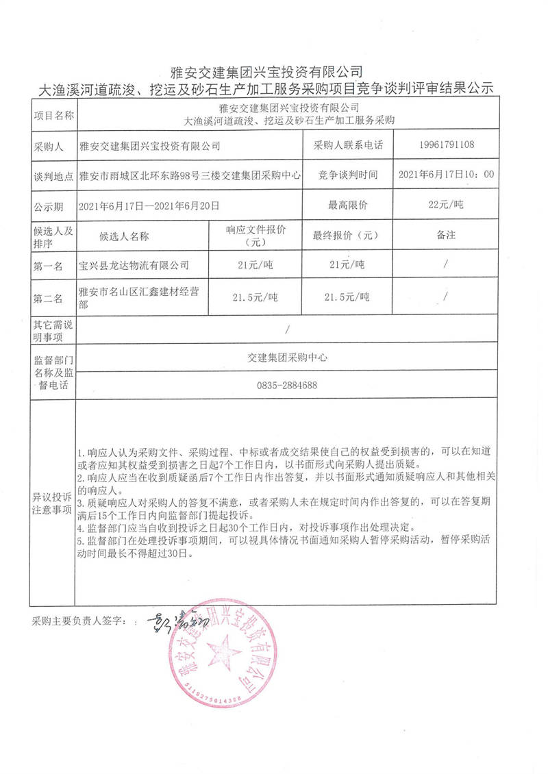 雅安交建集團(tuán)興寶投資有限公司大漁溪河道疏浚、挖運(yùn)及砂石生產(chǎn)加工服務(wù)采購項目競爭談判評審結(jié)果公示