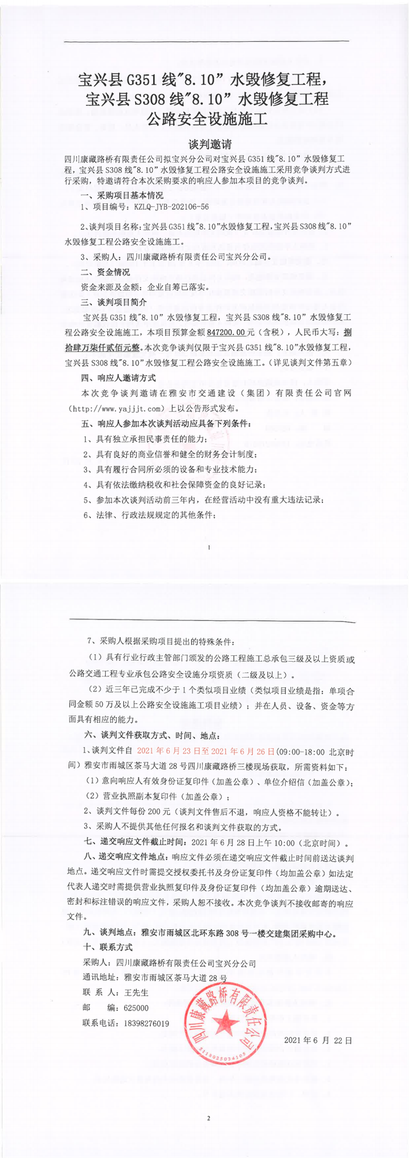 寶興縣G351線“8.10”水毀修復(fù)工程,寶興縣S308線“8.10”水毀修復(fù)工程公路安全設(shè)施施工競(jìng)爭(zhēng)談判公告