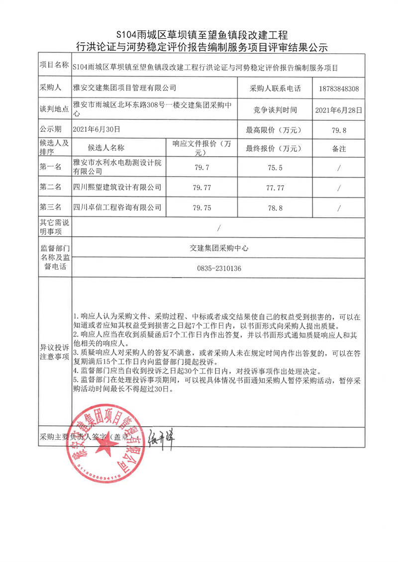 雅安交建集團(tuán)項(xiàng)目管理有限公司S104雨城區(qū)草壩鎮(zhèn)至望魚鎮(zhèn)段改建工程行洪論證與河勢穩(wěn)定評價(jià)報(bào)告編制服務(wù)項(xiàng)目評審結(jié)果公示
