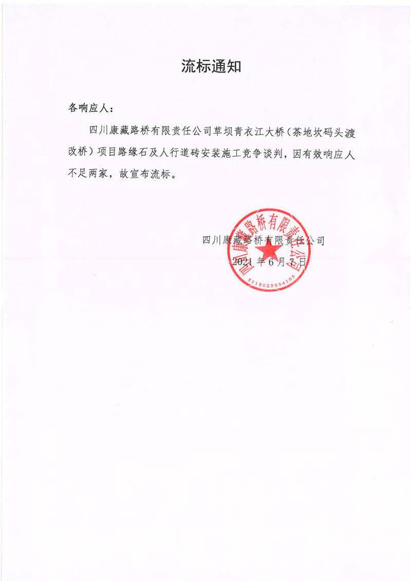 四川康藏路橋有限責(zé)任公司草壩青衣江大橋(茶地坎碼頭渡改橋)項目路緣石及人行道磚安裝施工競爭談判流標通知