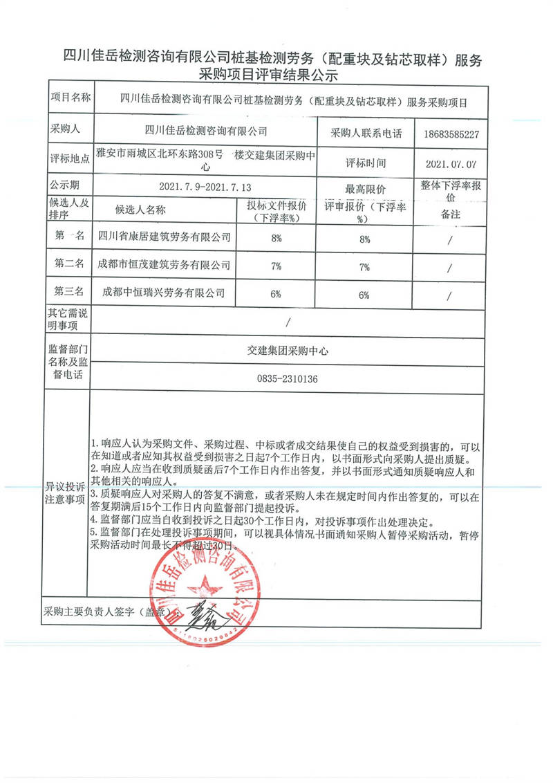 四川佳岳檢測(cè)咨詢(xún)有限公司樁基檢測(cè)勞務(wù)(配重塊及鉆芯取樣)服務(wù)采購(gòu)項(xiàng)目評(píng)審結(jié)果公示
