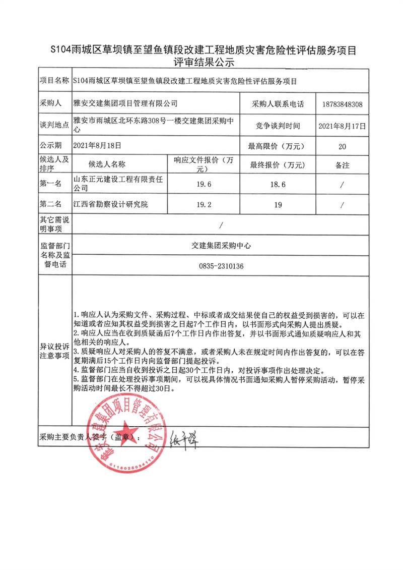 雅安交建集團(tuán)項(xiàng)目管理有限公司S104雨城區(qū)草壩鎮(zhèn)至望魚鎮(zhèn)改建工程地質(zhì)災(zāi)害危險(xiǎn)性評估服務(wù)項(xiàng)目評審結(jié)果公示