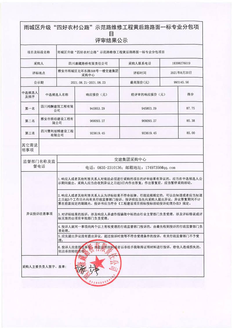四川康藏路橋有限責(zé)任公司雨城區(qū)升級“四好農(nóng)村公路”示范路維修工程黃后路路面一標(biāo)專業(yè)分包項目評審結(jié)果公示