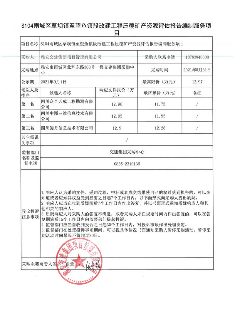 雅安交建集團(tuán)項(xiàng)目管理有限公司S104雨城區(qū)草壩鎮(zhèn)至望魚(yú)鎮(zhèn)段改建工程壓覆礦產(chǎn)資源評(píng)估報(bào)告編制服務(wù)項(xiàng)目評(píng)審結(jié)果公示