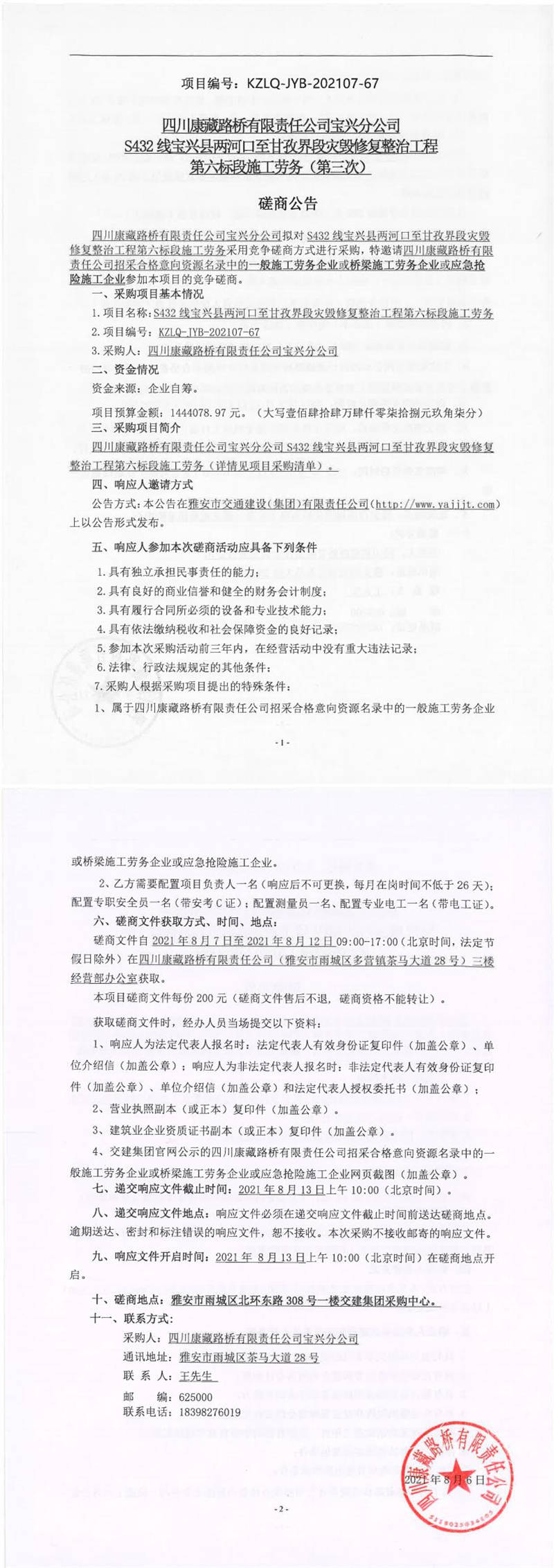 四川康藏路橋有限責(zé)任公司寶興分公司S432線寶興縣兩河口至甘孜界段災(zāi)毀修復(fù)整治工程第六標段施工勞務(wù)(第三次)競爭磋商公告