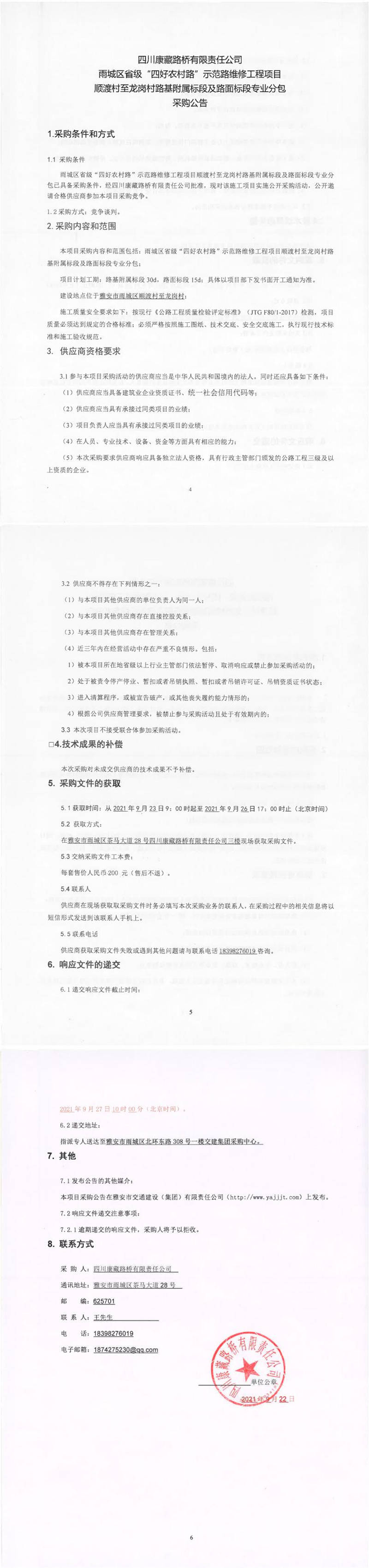 四川康藏路橋有限責(zé)任公司雨城區(qū)省級(jí)“四好農(nóng)村路”示范路維修工程項(xiàng)目順渡村至龍崗村路基附屬標(biāo)段及路面標(biāo)段專(zhuān)業(yè)分包采購(gòu)公告