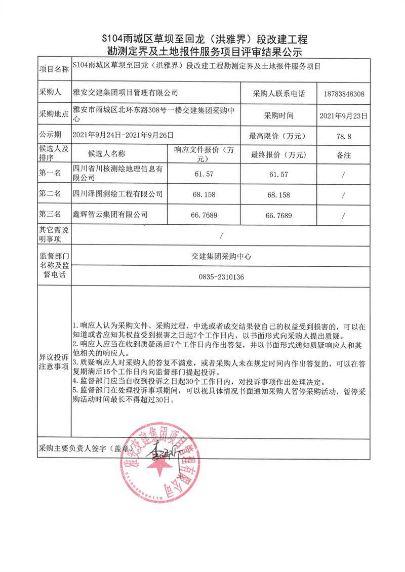 雅安交建集團(tuán)項(xiàng)目管理有限公司S104雨城區(qū)草壩至回龍(洪雅界)段改建工程勘測(cè)定界及土地報(bào)件服務(wù)項(xiàng)目評(píng)審結(jié)果公示