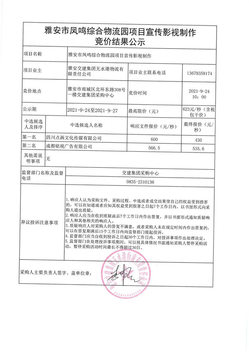 雅安交建集團(tuán)無水港物流有限責(zé)任公司雅安市鳳鳴綜合物流園項(xiàng)目宣傳影視制作競價結(jié)果公示