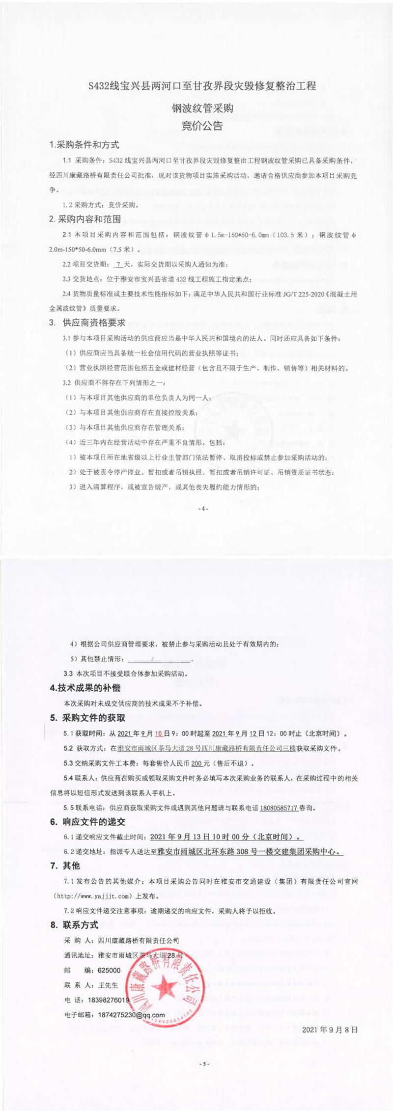 四川康藏路橋有限責(zé)任公司S432線寶興縣兩河口至甘孜界段災(zāi)毀修復(fù)整治工程鋼波紋管采購(gòu)競(jìng)價(jià)公告