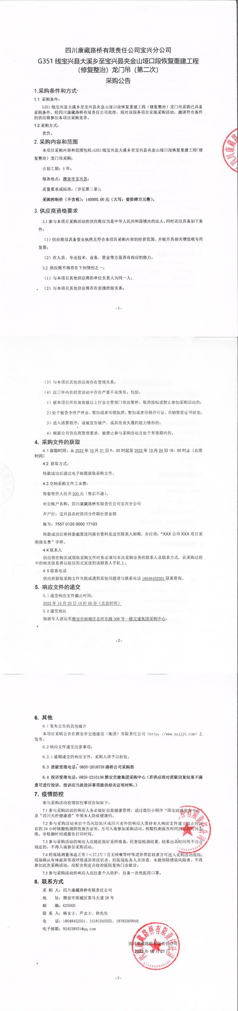 四川康藏路橋有限責(zé)任公司寶興分公司G351線寶興縣大溪鄉(xiāng)至寶興縣夾金山埡口段恢復(fù)重建工程(修復(fù)整治)龍門吊(第二次)采購公告