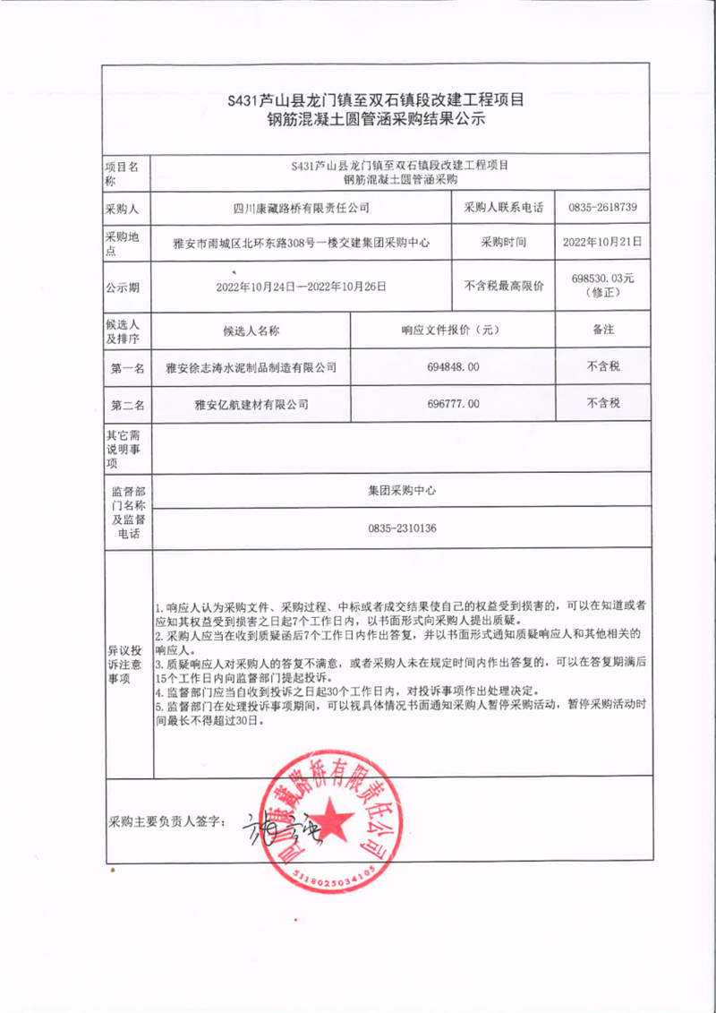 四川康藏路橋有限責(zé)任公司S431蘆山縣龍門(mén)鎮(zhèn)至雙石鎮(zhèn)段改建工程項(xiàng)目鋼筋混凝土圓管涵采購(gòu)結(jié)果公示
