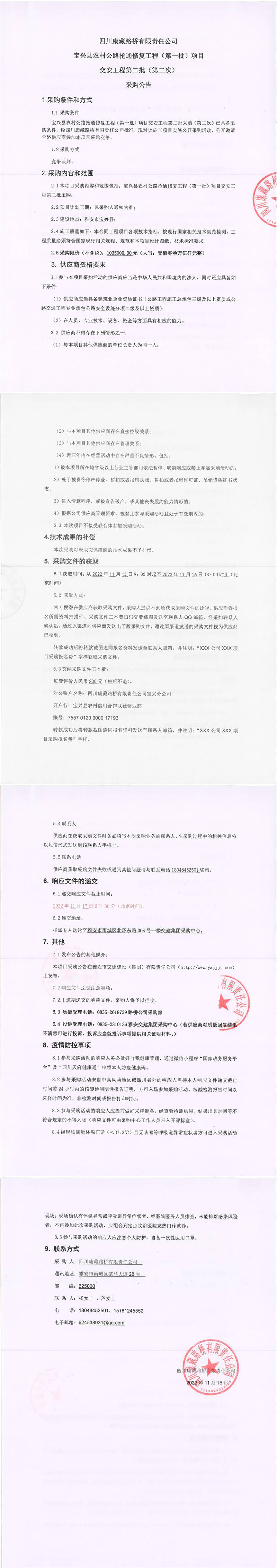 四川康藏路橋有限責(zé)任公司寶興縣農(nóng)村公路搶通修復(fù)工程(第一批)項(xiàng)目交安工程第二批(第二次)采購公告