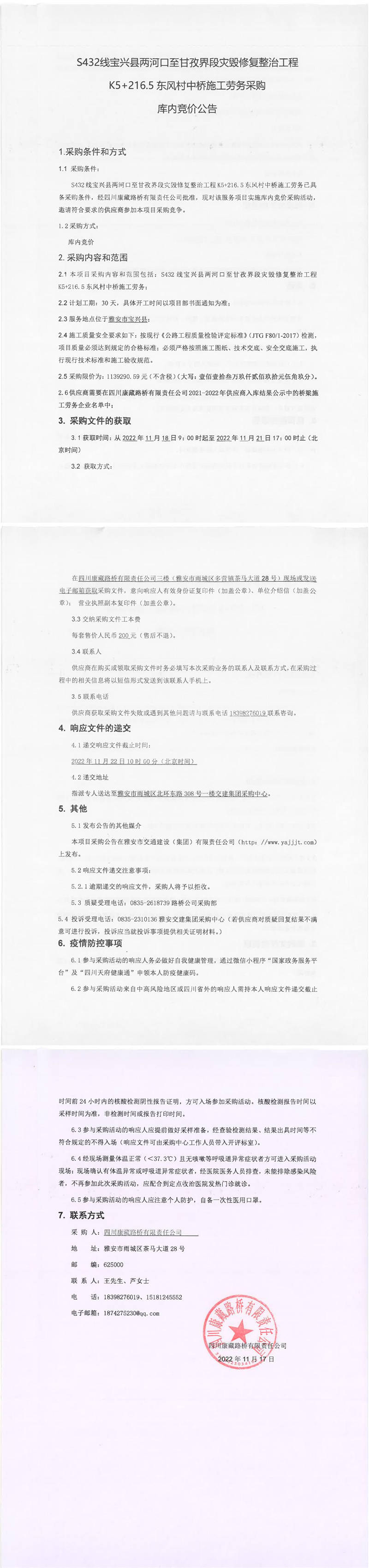 四川康藏路橋有限責任公司S432線寶興縣兩河口至甘孜界段災毀修復整治工程K5+216.5東風村中橋施工勞務采購庫內(nèi)競價公告