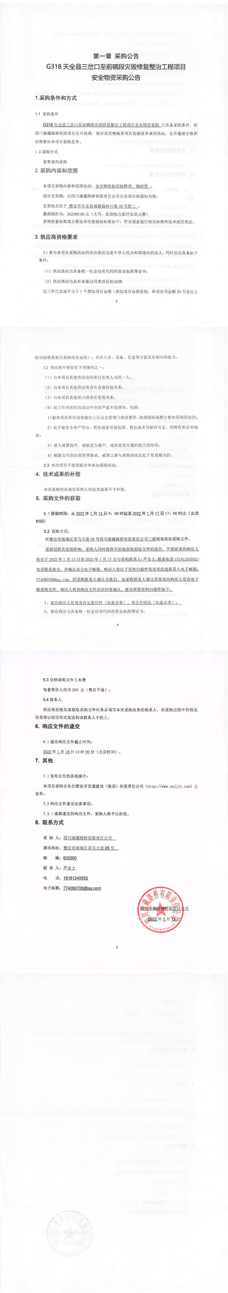 四川康藏路橋有限責(zé)任公司G318天全縣三岔口至前碉段災(zāi)毀修復(fù)整治工程項目安全物資采購公告