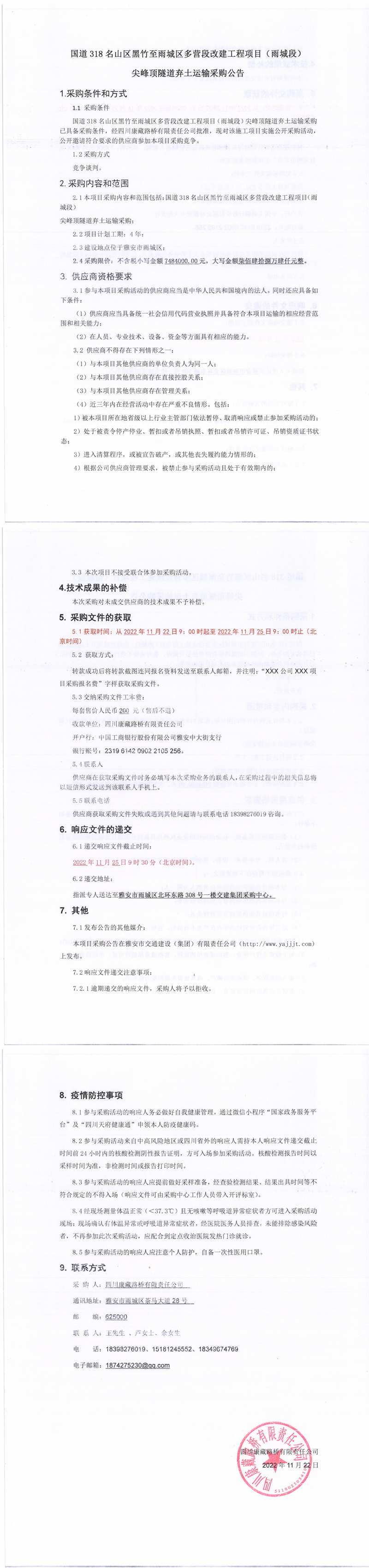 四川康藏路橋有限責(zé)任公司國道318名山區(qū)黑竹至雨城區(qū)多營段改建工程項目(雨城段)尖峰頂隧道棄土運輸采購公告