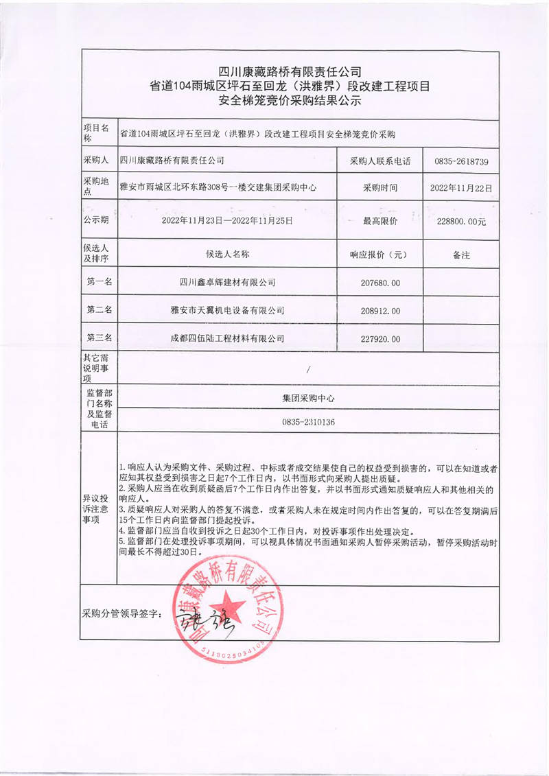 四川康藏路橋有限責(zé)任公司省道104雨城區(qū)坪石至回龍(洪雅界)段改建工程項(xiàng)目安全梯籠競價(jià)采購結(jié)果公示