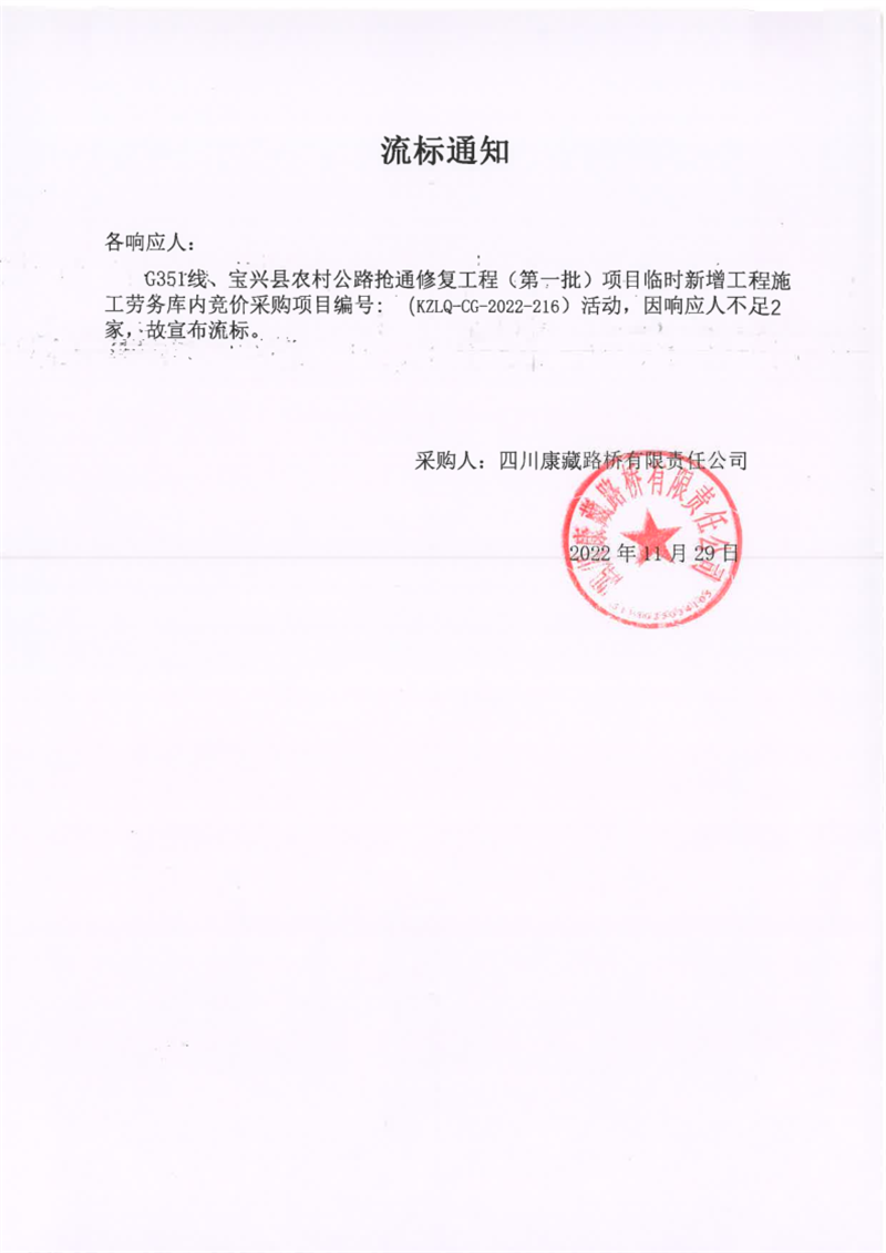 四川康藏路橋有限責任公司G351線、寶興縣農(nóng)村公路搶通修復(fù)工程(第一批)項目臨時新增工程施工勞務(wù)庫內(nèi)競價采購流標通知