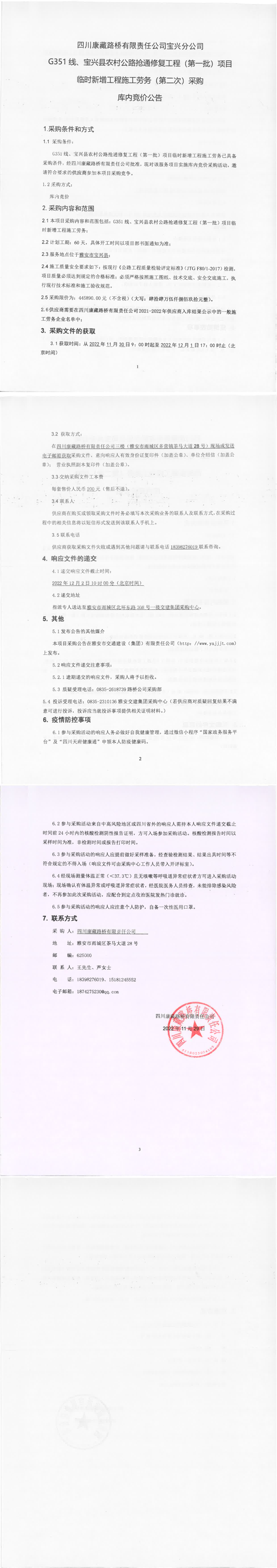 四川康藏路橋有限責(zé)任公司G351線、寶興縣農(nóng)村公路搶通修復(fù)工程(第一批)項(xiàng)目臨時(shí)新增工程施工勞務(wù)(第二次)采購(gòu)庫(kù)內(nèi)競(jìng)價(jià)公告