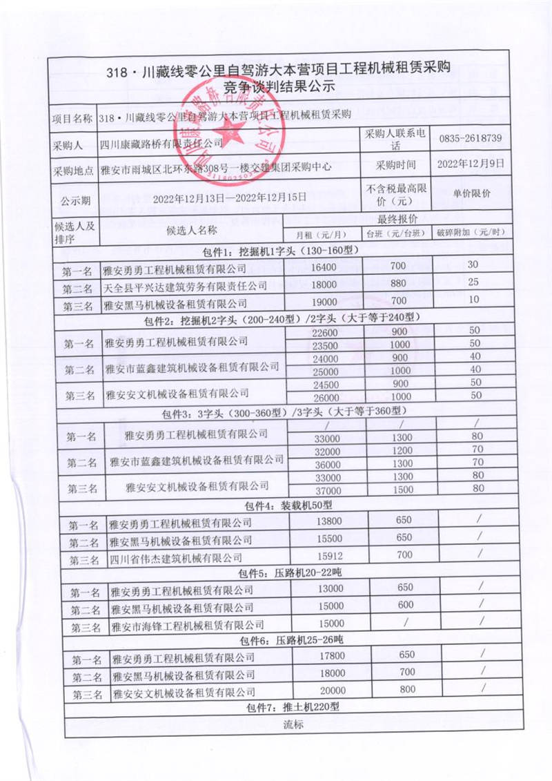四川康藏路橋有限責任公司318.川藏線零公里自駕游大本營項目工程機械租賃采購競爭談判結果公示