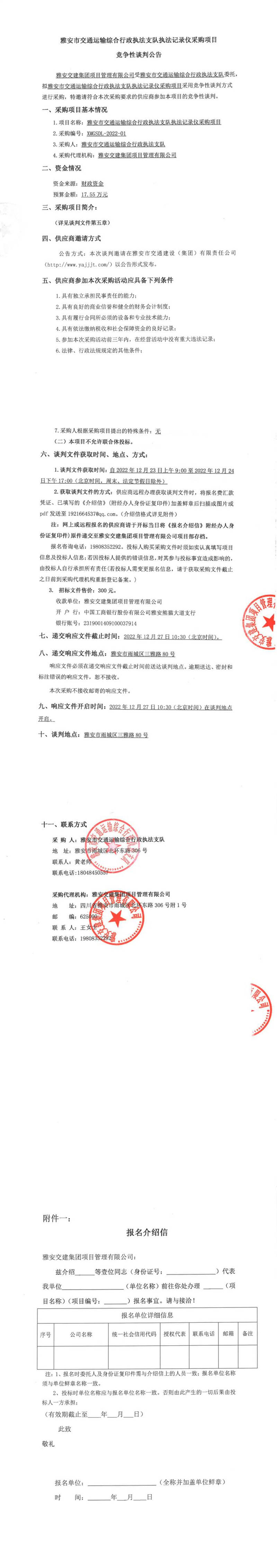 雅安交建集團(tuán)項(xiàng)目管理有限公司雅安市交通運(yùn)輸綜合行政執(zhí)法支隊(duì)執(zhí)法記錄儀采購項(xiàng)目競爭性談判公告