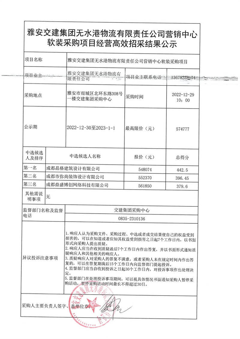 雅安交建集團(tuán)無水港物流有限責(zé)任公司營銷中心軟裝采購項目經(jīng)營高效招采結(jié)果公示