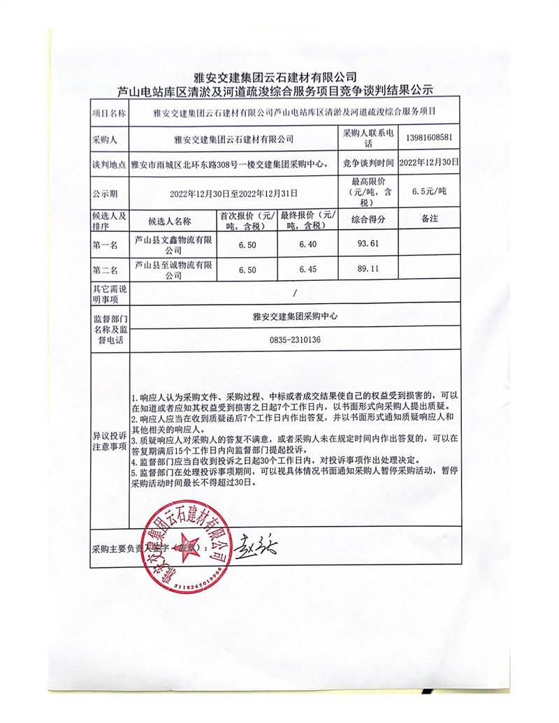 雅安交建集團(tuán)云石建材有限公司蘆山電站庫(kù)區(qū)清淤及河道疏浚綜合服務(wù)項(xiàng)目競(jìng)爭(zhēng)談判結(jié)果公示
