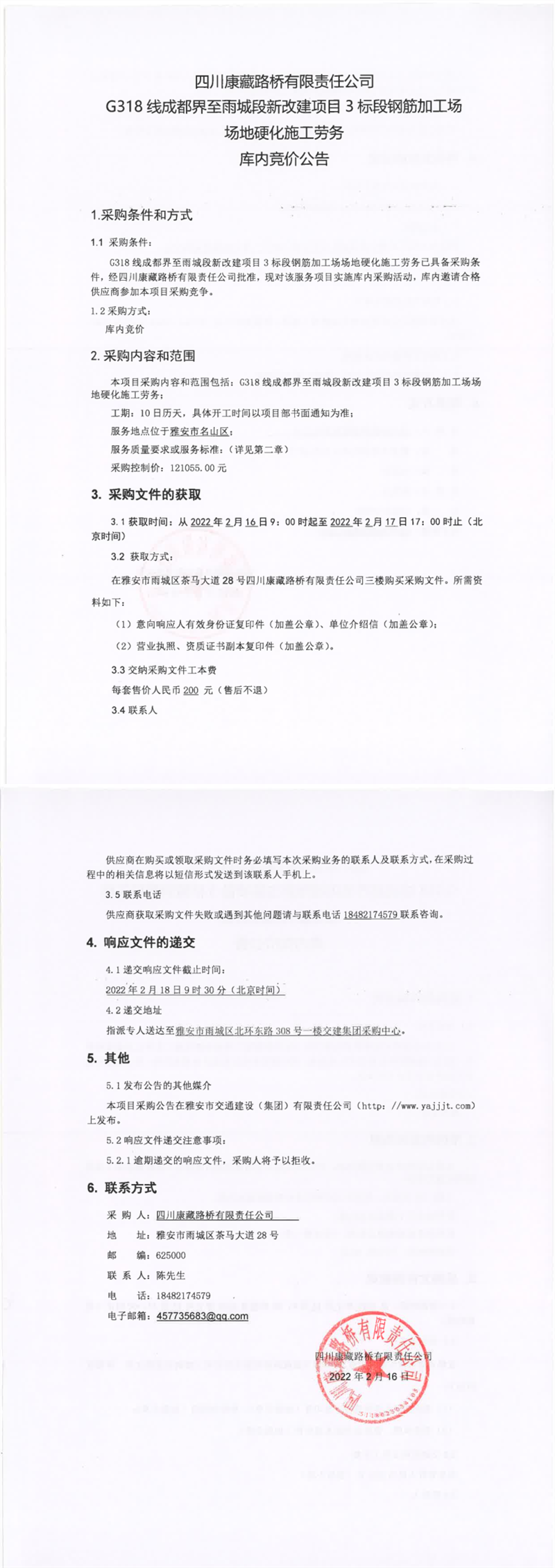 四川康藏路橋有限責(zé)任公司G318線成都界至雨城段新改建項目3標段鋼筋加工場場地硬化施工勞務(wù)庫內(nèi)競價公告