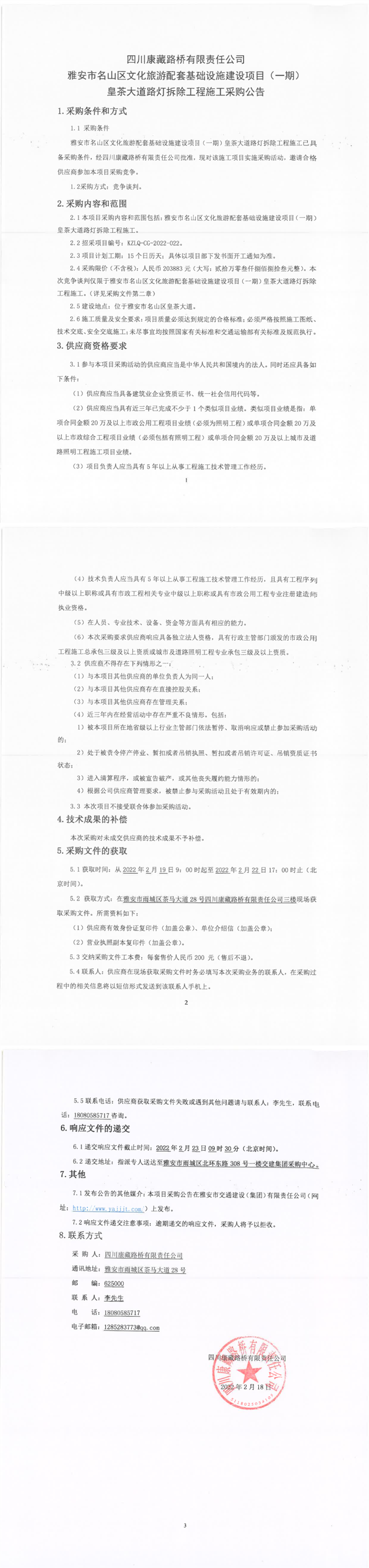 四川康藏路橋有限責(zé)任公司雅安市名山區(qū)文化旅游配套基礎(chǔ)設(shè)施建設(shè)項目(一期)皇茶大道路燈拆除工程施工采購公告