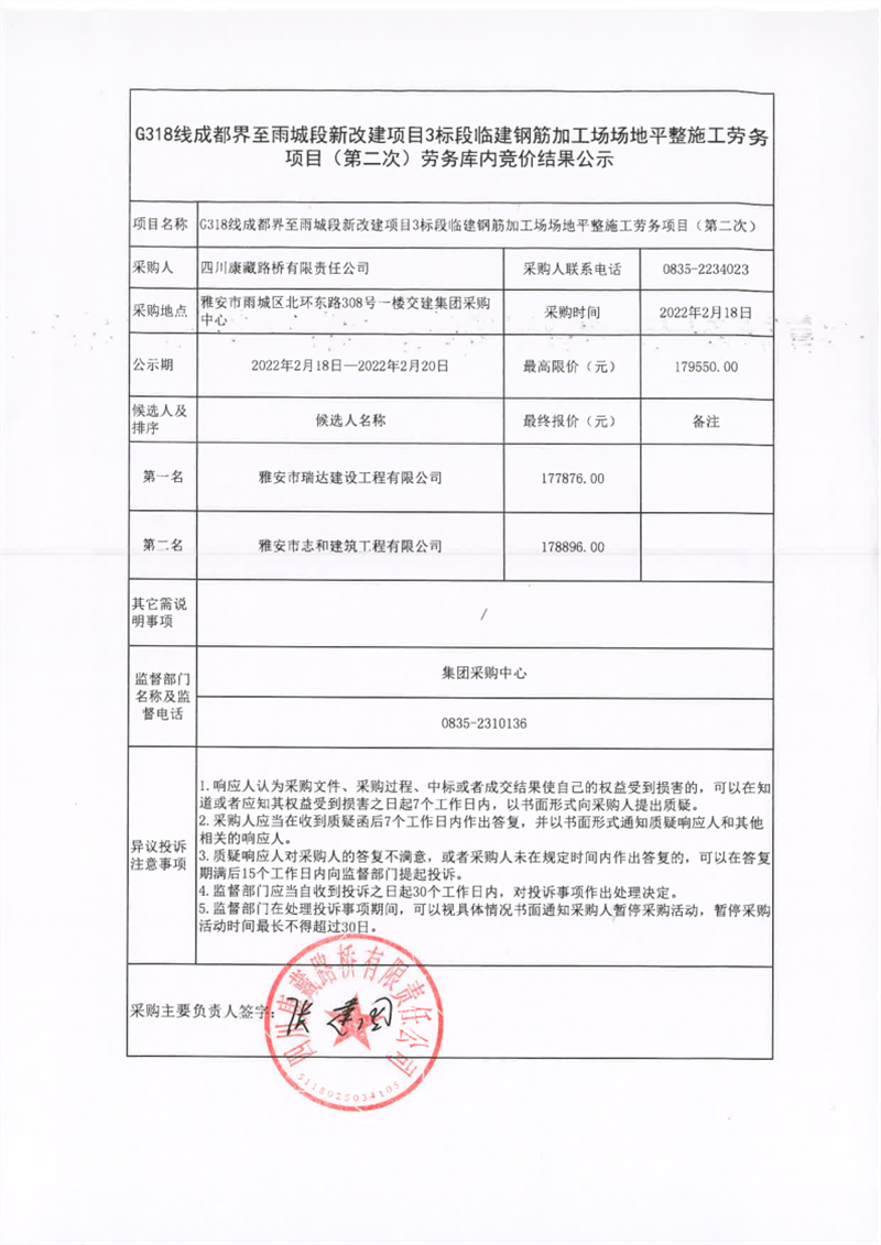四川康藏路橋有限責任公司G318線成都界至雨城段新改建項目3標段臨建鋼筋加工場場地平整施工勞務(第二次)庫內(nèi)競價結(jié)果公示