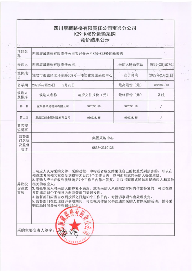 四川康藏路橋有限責任公司寶興分公司K29-K48砼運輸采購競價結(jié)果公示