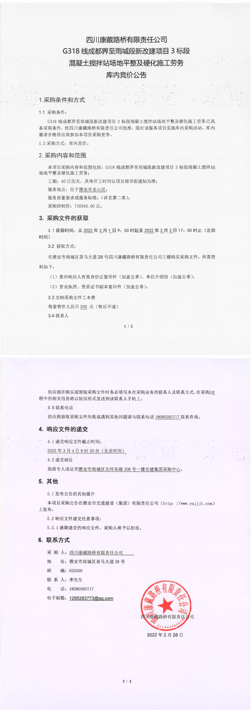 四川康藏路橋有限責(zé)任公司G318線成都界至雨城段新改建項(xiàng)目3標(biāo)段混凝土攪拌站場(chǎng)地平整及硬化施工勞務(wù)庫(kù)內(nèi)競(jìng)價(jià)公告