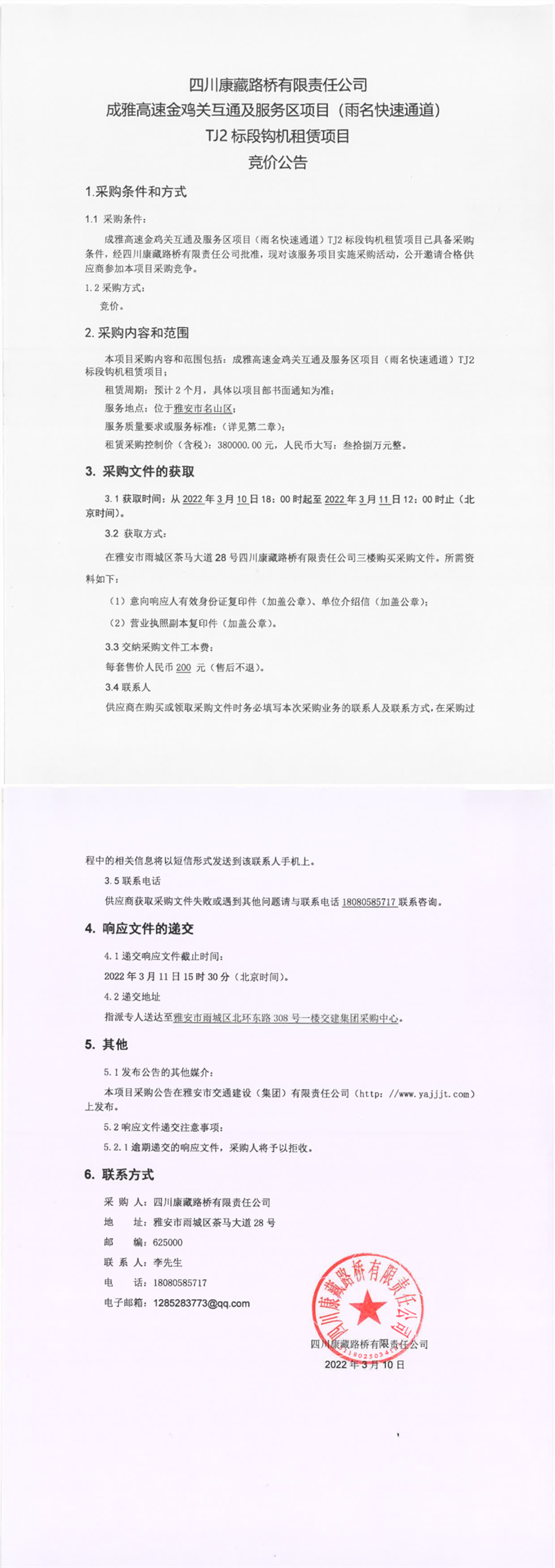 四川康藏路橋有限責(zé)任公司成雅高速金雞關(guān)互通及服務(wù)區(qū)項目(雨名快速通道)TJ2標(biāo)段鉤機租賃項目競價公告